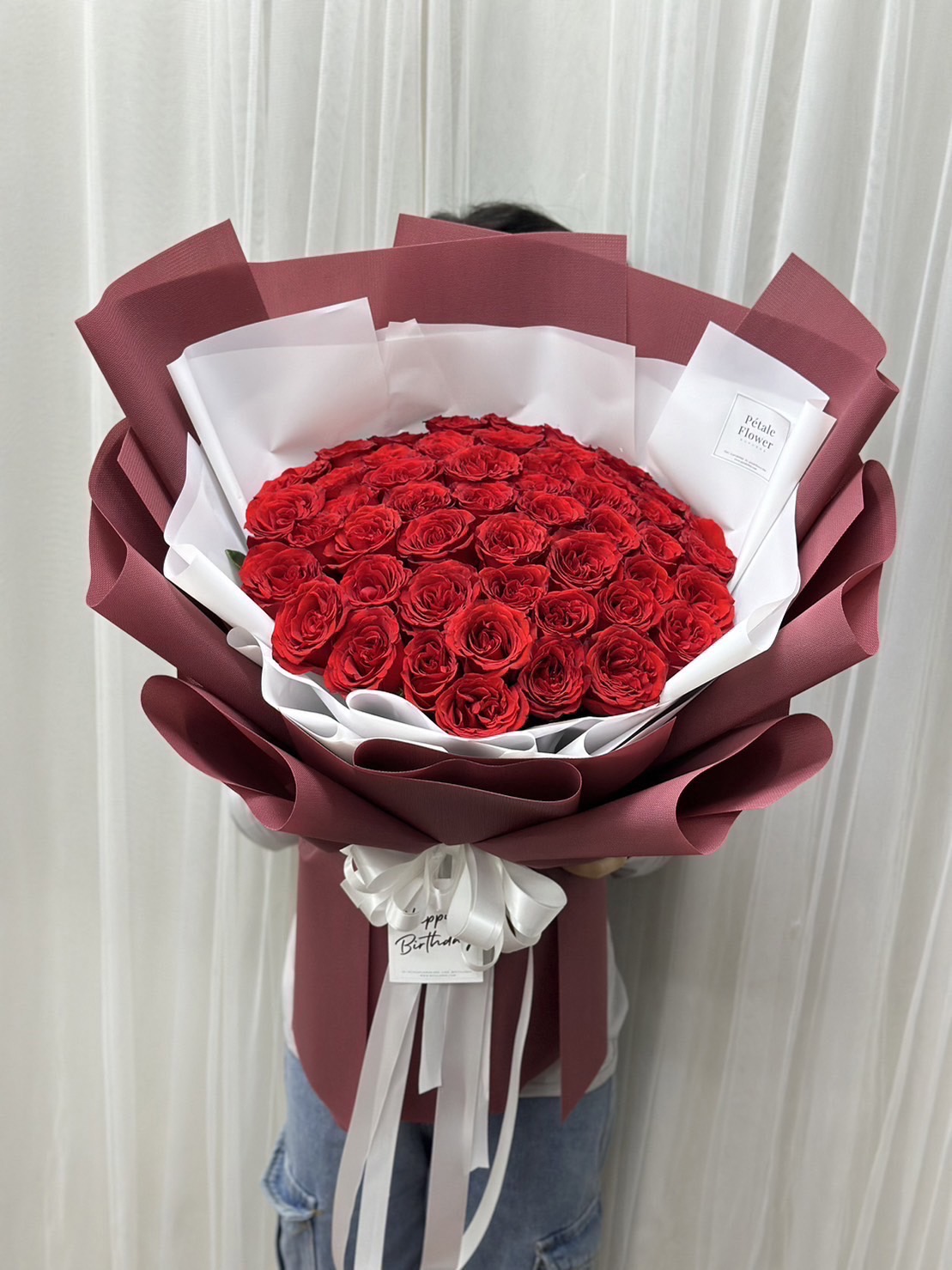 ช่อกุหลาบแดงนอก 50 ดอก ห่อแดงดูหรูหราพรีเมี่ยมมากๆ