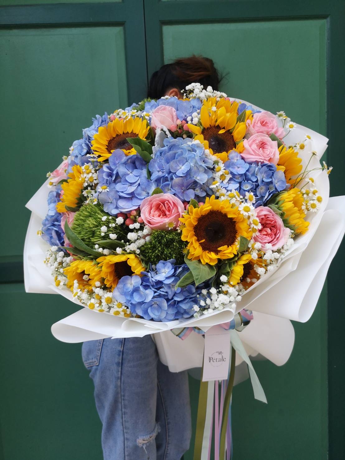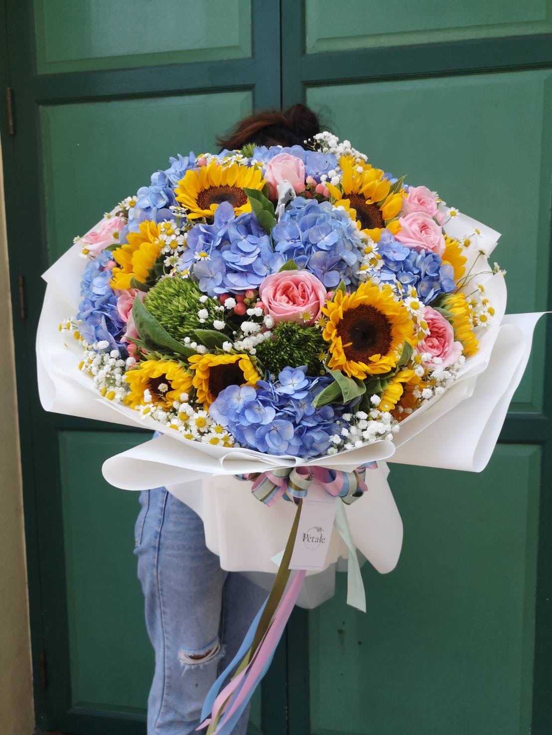 Tags: ช่อดอกทานตะวัน, ช่อดอกไม้สีพาสเทล, ช่อดอกไม้สีฟ้า, ช่อดอกไฮเดรนเยีย