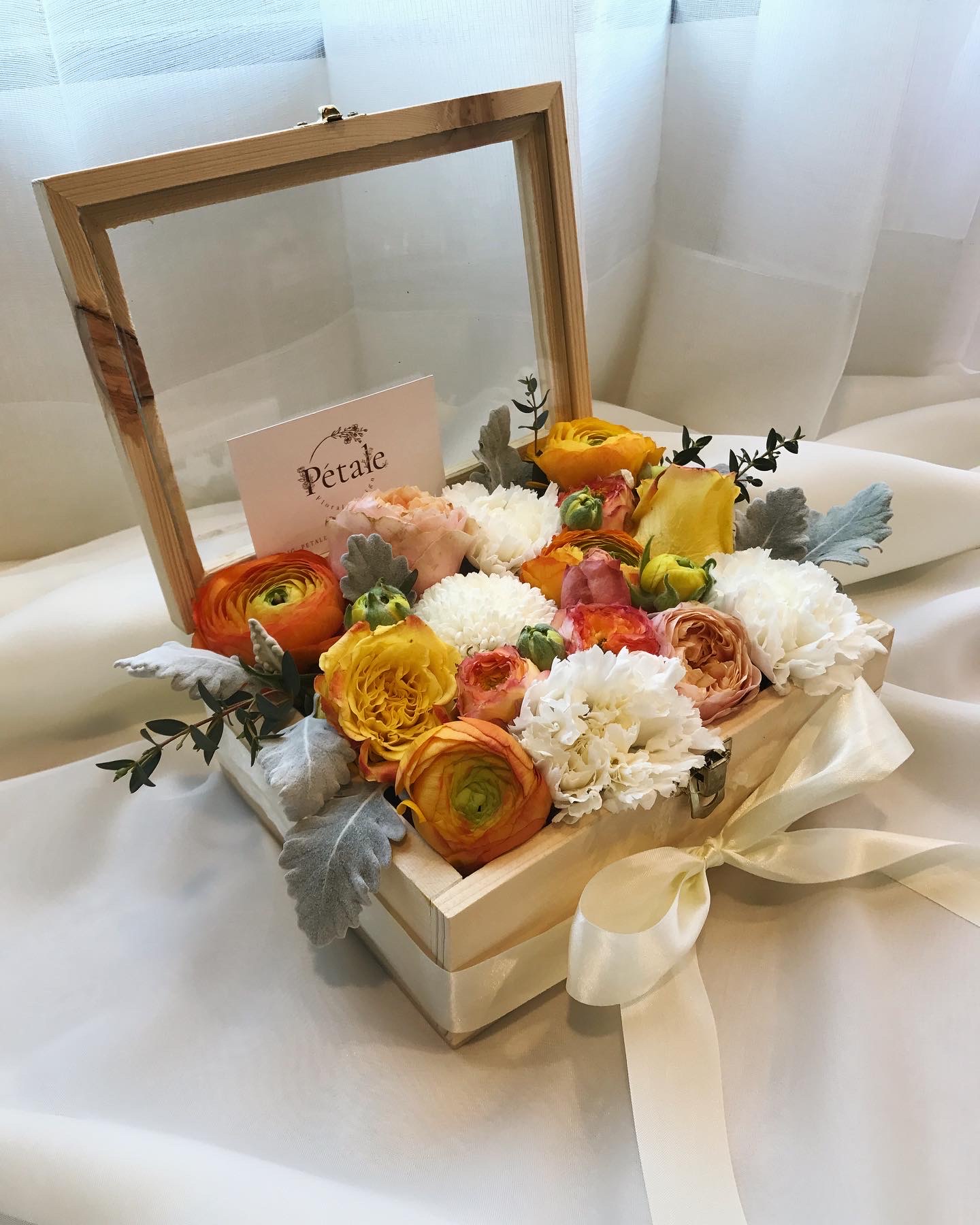 กล่องดอกไม้โทนสีส้มเหลือง ประกอบด้วยดอกไม้นอกเกรดพรีเมี่ยมนานาชนิด